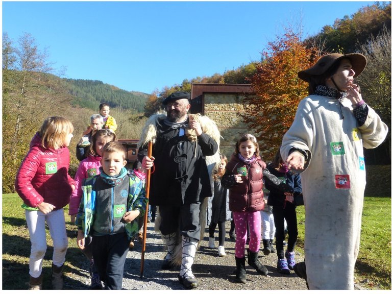 La guía nos invita a salir fuera del museo y conocemos otro personaje, Burdintxo, un ferrón muy alegre que nos cuenta que suele ver a Olentzero asiduamente en el Valle del Hierro, ya que le trae el carbón que necesita para trabajar. De pronto, un hombretón cubierto de lanas y la cara un tanto ennegrecida (bueno las cosas por su nombre, sucia del carbón) aparece bajando del monte. Los niños se emocionan y lo llaman, algunos casi hasta quedarse afónicos… y para alegría de todos, parece que ha surgido efecto, porque se acerca. Confirmado. No hay duda, ¡es el señor Olentzero!